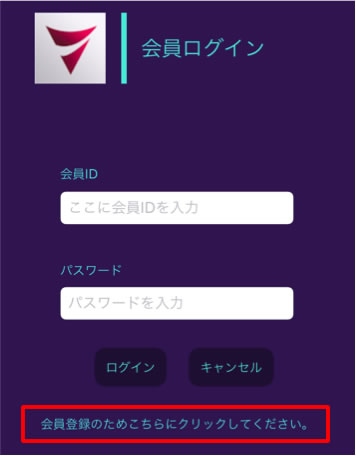 【スマートフォン側の設定】赤枠内の”会員登録のためにこちらをクリックして下さい”をタップし会員情報入力画面へ遷移して下さい。