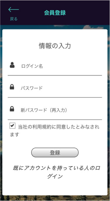 【スマートフォン側の設定】ログイン名、パスワードを入力し、利用規約に同意した上で登録ボタンをタップして下さい。