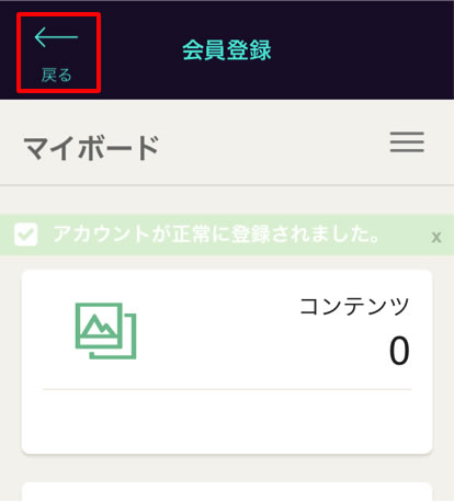 【スマートフォン側の設定】会員登録が終わると左記のページが表示されます。赤枠内の”戻る”をタップし、ログイン画面へ遷移して下さい。